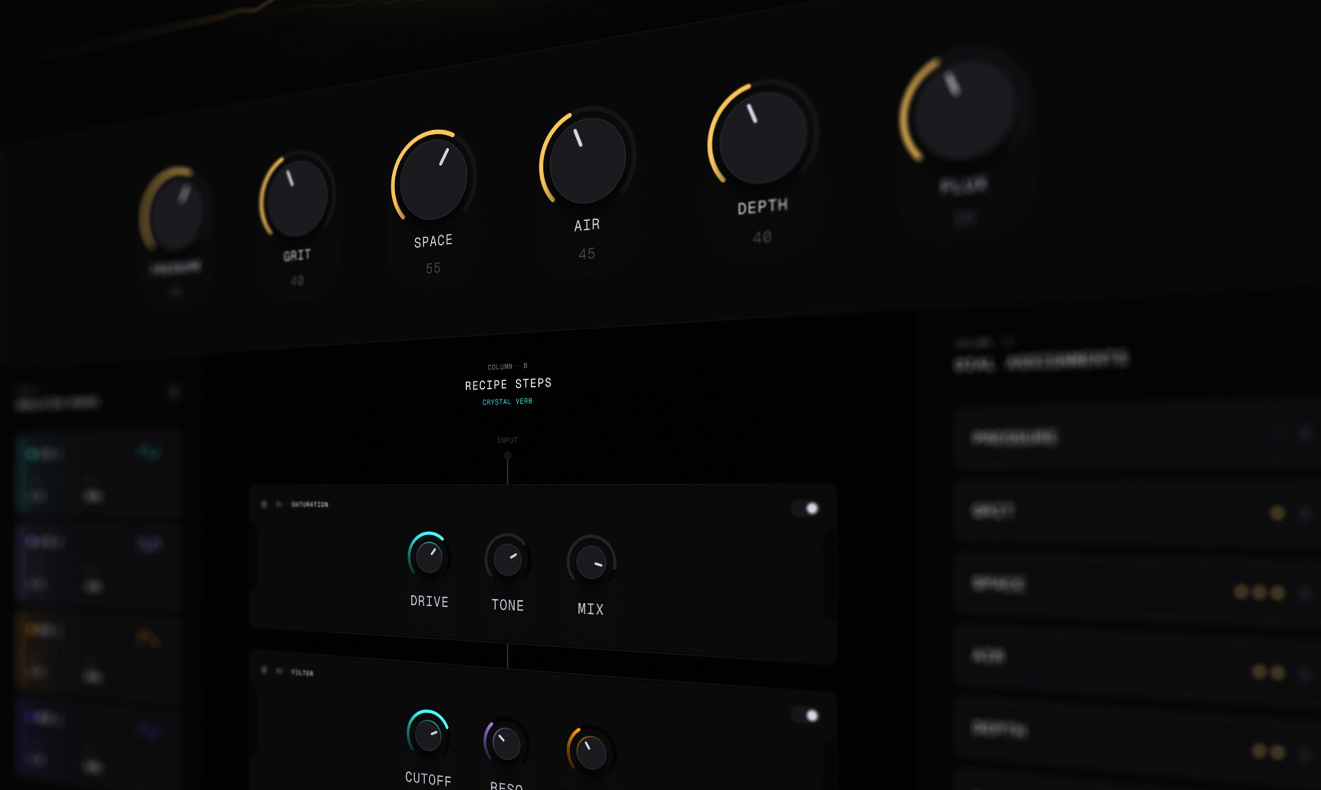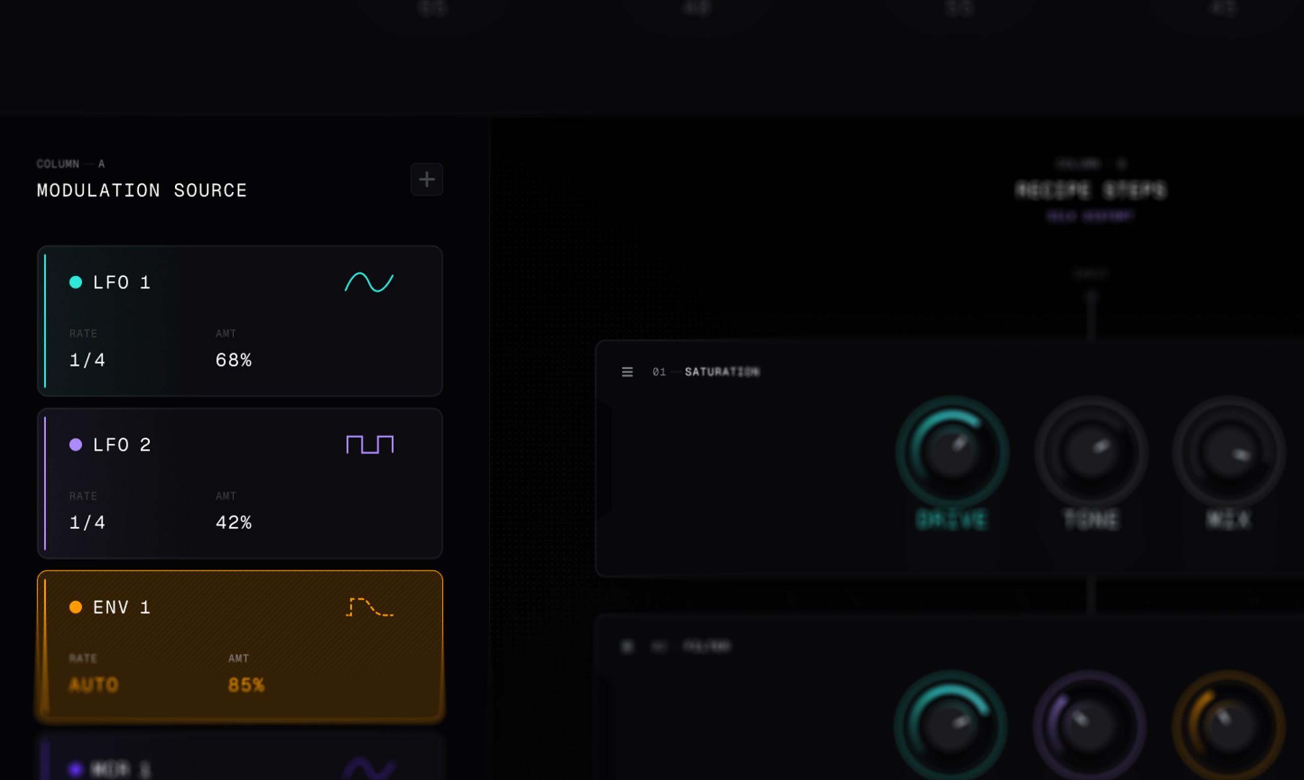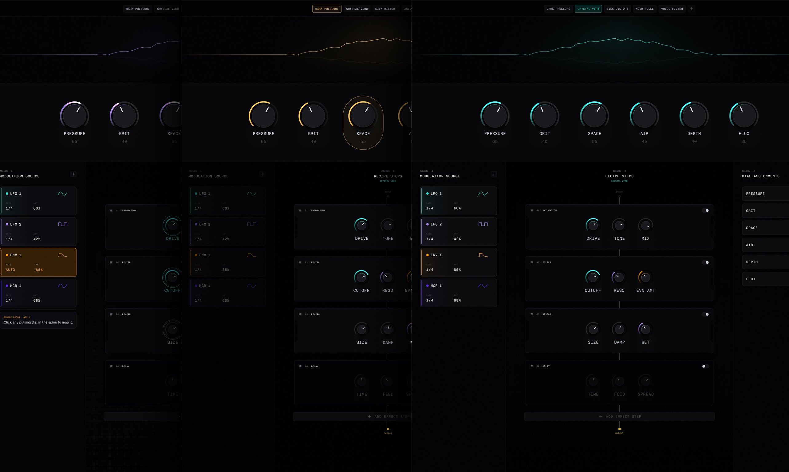 The Glass Rack. Audio flows down the centre column. Modulation sources drop in on the left. Macro controls live on the right. This isn't just a layout — it's a mental model. Once you understand the three-column structure, you understand the whole instrument. Nothing is hidden, nothing requires explanation.