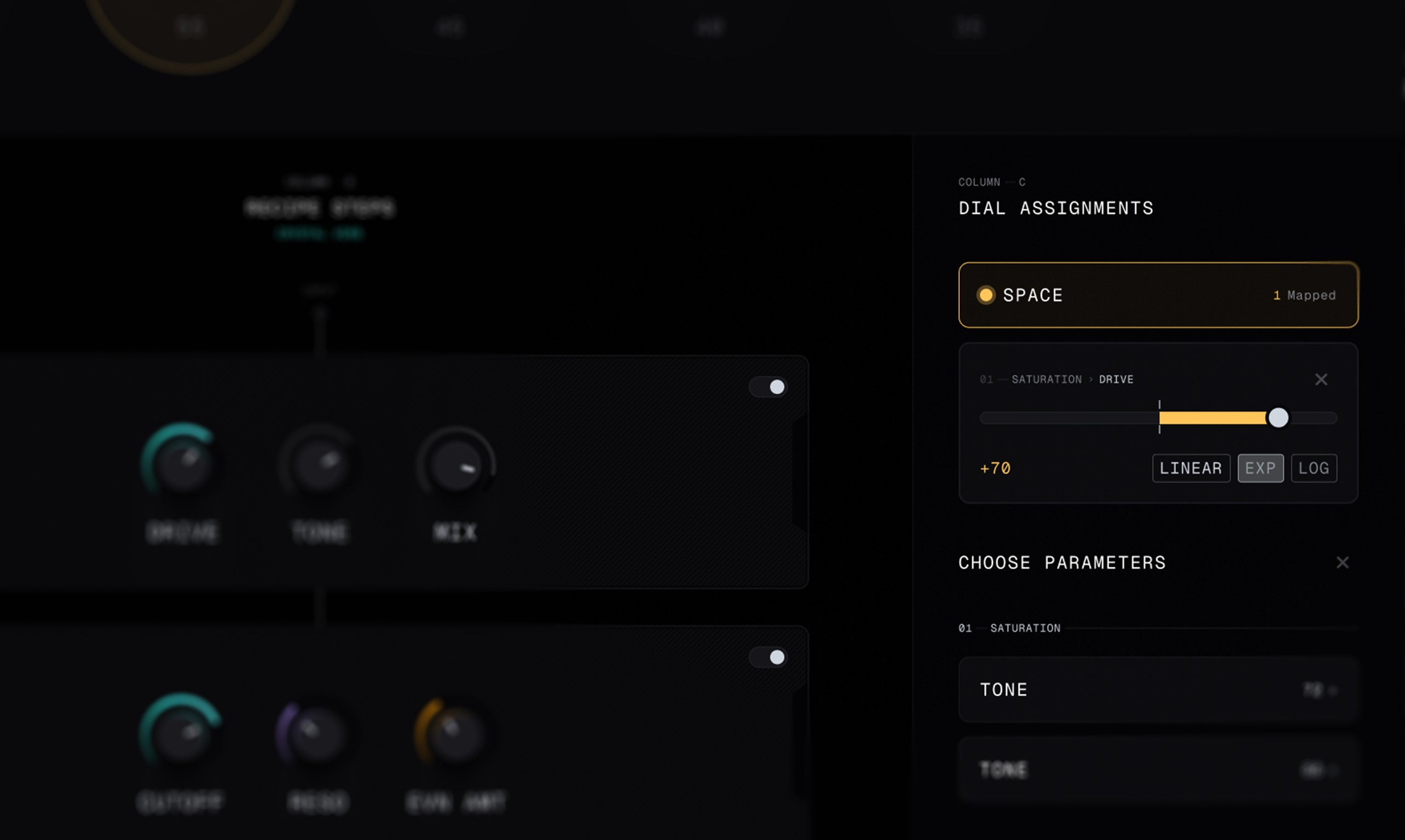 Six dials as a performance surface. The Shell Dials sit above the rack and control whatever you assign them to. They're not channel faders or transport controls — they're a custom front panel you build yourself. In Perform mode, they fill the screen. The instrument you designed becomes the instrument you play.